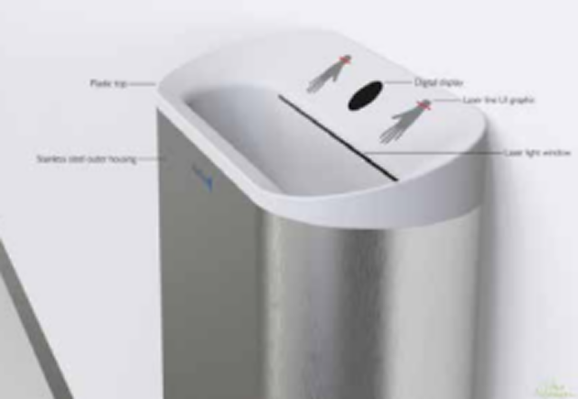 DECON automatically detects the hands when inserted in the disinfection chamber, ozonized water is sprayed on the hands and a display count down to zero seconds. A paper towel is dispensed for drying the hands